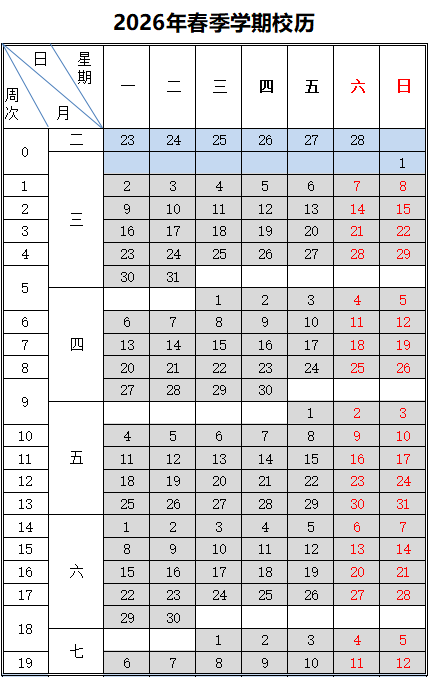 2026年春季学期校历