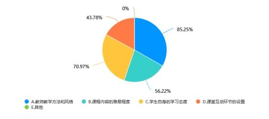 调查结果显示,85.25%的学生认为“课程内容的难易程度”是主要因素,70.97%的学生提及“教师教学方法和风格”,56.22%的学生认为“学生自身的学习态度”有影响,43.78% 的学生关注“课堂互动环节的设置”,选择“其他”因素的学生占比为0%。可见课程内容难度、教师教学方式、学生学习态度及课堂互动设计均对课堂氛围存在显著影响,其中课程内容难易程度的影响最为突出。