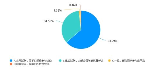 调查结果显示,63.59%的学生认为班级课堂学习气氛“非常活跃,同学们积极参与讨论”,34.56%的学生认为“比较活跃,大部分同学能认真听讲”,积极评价占比高达98.15%;仅1.38%的学生觉得氛围“一般,部分同学参与度不高”,0.46%的学生认为“比较沉闷,同学们积极性较低”。数据反映出新学期班级课堂整体保持活跃状态,学生参与课堂的积极性较高。