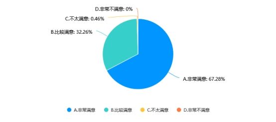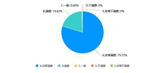 调查结果显示,79.72%的学生表示“非常满意”,19.82%的学生表示“满意”,整体满意度高达99.54%;仅0.46%的学生认为“一般”,选择“不满意”和“非常不满意”的学生占比均为0%。这充分体现出学生对任课教师认真负责的教学态度高度认可,教师教学态度得到广泛肯定。