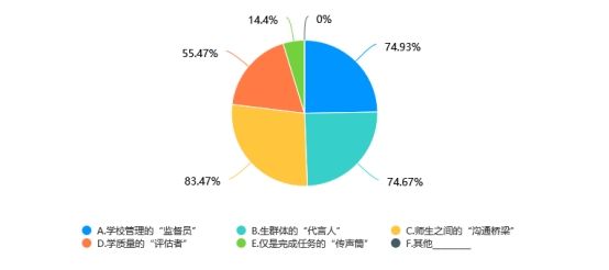 调查结果显示,83.47%的信息员认为自身是“师生之间的沟通桥梁”,74.93%和74.67%分别认为是“学校管理的监督员”和“学生群体的代言人”,55.47%认为是“教学质量的评估者”,14.4%学生认为是“完成任务的传声筒”。这说明信息员对自身角色定位清晰,具备较强的服务意识和监督意识。