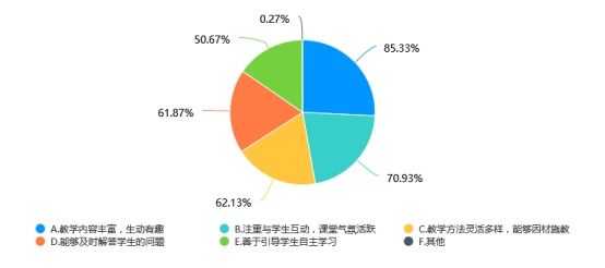 调查结果显示,85.33%的学生认为“教学内容丰富,生动有趣”,70.93%的学生认为“注重与学生互动,课堂气氛活跃”,62.13%和61.87%的学生分别认为“教学方法灵活多样,能够因材施教”和“能够及时解答学生的问题”,还有50.67%的学生认为“善于引导学生自主学习”。这表明教师在教学方法上的多元化设计与互动引导能力表现突出,能有效激发学生学习主动性。