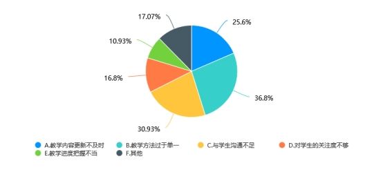 调查结果显示,25.6%的学生认为“教学内容更新不及时”,36.8%的学生认为“教学方法过于单一”,30.93%学生认为“与学生沟通不足”16.8%和10.93%的学生分别认为“对学生的关注度不够”和“教学进度把握不当”。可见学期中段学生对教师的教学进度的精准把控、教学方法的创新升级及教学内容的与时俱进有了更高需求。