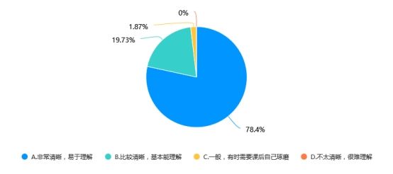调查结果显示,78.4%的学生认为“非常清晰,易于理解”,19.73%的学生认为“比较清晰,基本能理解”,1.87%的学生认为“一般,有时需要课后自己琢磨”,没有学生认为“不太清晰,很难理解”。这表明多数学生对教师教学内容讲解的清晰程度持认可态度。