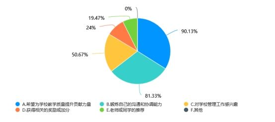 调查结果显示,90.13%的信息员选择“希望为学校教学质量提升贡献力量”;81.33%的信息员选择“锻炼自己的沟通和协调能力”;50.67%的信息员选择“对学校管理工作感兴趣”;24%和19.47%的信息员分别选择“获得相关的奖励或加分”和“老师或同学的推荐”。这表明信息员任职动机以服务教学、自我提升为主,具有较强的责任感和积极性。