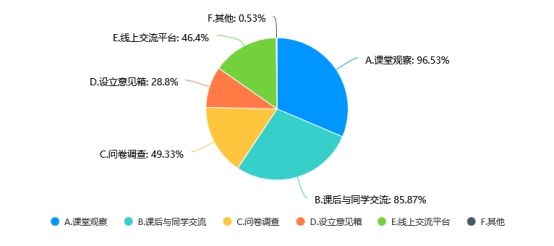调查结果显示,96.53%的信息员通过“课堂观察”获取信息,85.87%会“课后与同学交流”,49.33%采用“问卷调查”,46.4%借助“线上交流平台”,28.8%选择“设立意见箱”,仅0.53%选择“其他”。可见信息员主要依托课堂和课后交流收集反馈,渠道较为传统且高效,线上平台和问卷调研也成为重要补充。