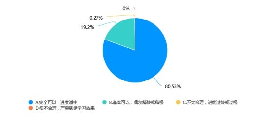 调查结果显示,80.53%的学生认为“完全可以,进度适中”,19.2%的学生表示“基本可以,偶尔稍快或稍慢”,仅0.27%的学生觉得教学进度“不太合理,进度过快或过慢”,无学生认为进度安排“很不合理,严重影响学习效果”。整体而言,教师对教学进度的把控能力得到学生广泛认可,仅存在个别课程进度微调的需求。